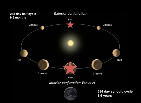 Cada 19 meses, 1,6 años = 584 días: Venus completa un ciclo sinódico completo de una conjunción inferior a la siguiente. Lugar de encuentro de significado sinódico, en este caso el lugar de encuentro de Sol / Tierra / Venus.